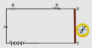 First take a straight thick copper wire and place it between the points X and Y in an electric circuit, as shown in Fig. 1. Figure 1: compass needle is deflected when it is placed near a current carrying wire